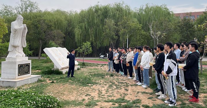 在孔子像前,郑小九教授结合孔子“温而厉”的形象,向同学们阐述了孔子作为学者学而不倦的为学理念,以及诲人不倦的师道教风;在历史文化园柳园里,以柳树为喻,引出孔子“君子不器”的理念,宣讲学校对广大学子博学多艺、全面发展的培养目标;在历史名人广场上,郑小九教授鼓励大家要向前辈先贤学习,追求美好品德,学好专业知识,为国家民族多做贡献;在校风校训石前,郑小九教授耐心细致地讲解了校训和校风的历史渊源及深刻涵义。课堂最后,郑小九教授希望青年学生要拓宽眼界,不局限于一技一艺,为以后的发展奠定坚实的基础;要见贤思齐,做好新时代的答卷人,走好新时代的长征路;要负重致远,使命呼唤担当,面对挫折时心态要健康,在艰苦曲折中提升品德。