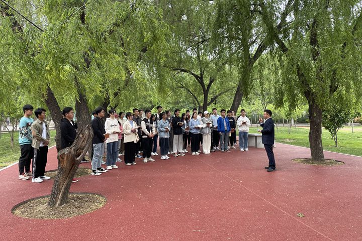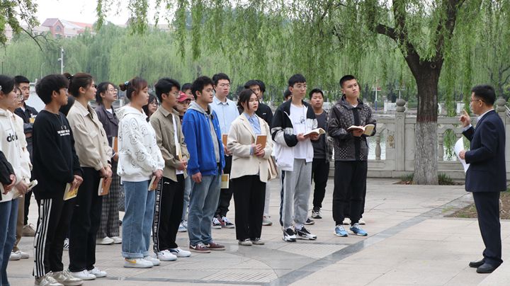 怎样办好新时代的“大思政课”?怎样把有高度的事情讲得有温度?怎样把“天下事”讲成“身边事”?4月14日,马克思主义学院院长郑小九创新教学方式方法,把课堂搬出教室,采用现场情景教学模式,为学校青年马克思主义研习社的学子们讲授了一堂别开生面的行走在校园里的“大思政课”。