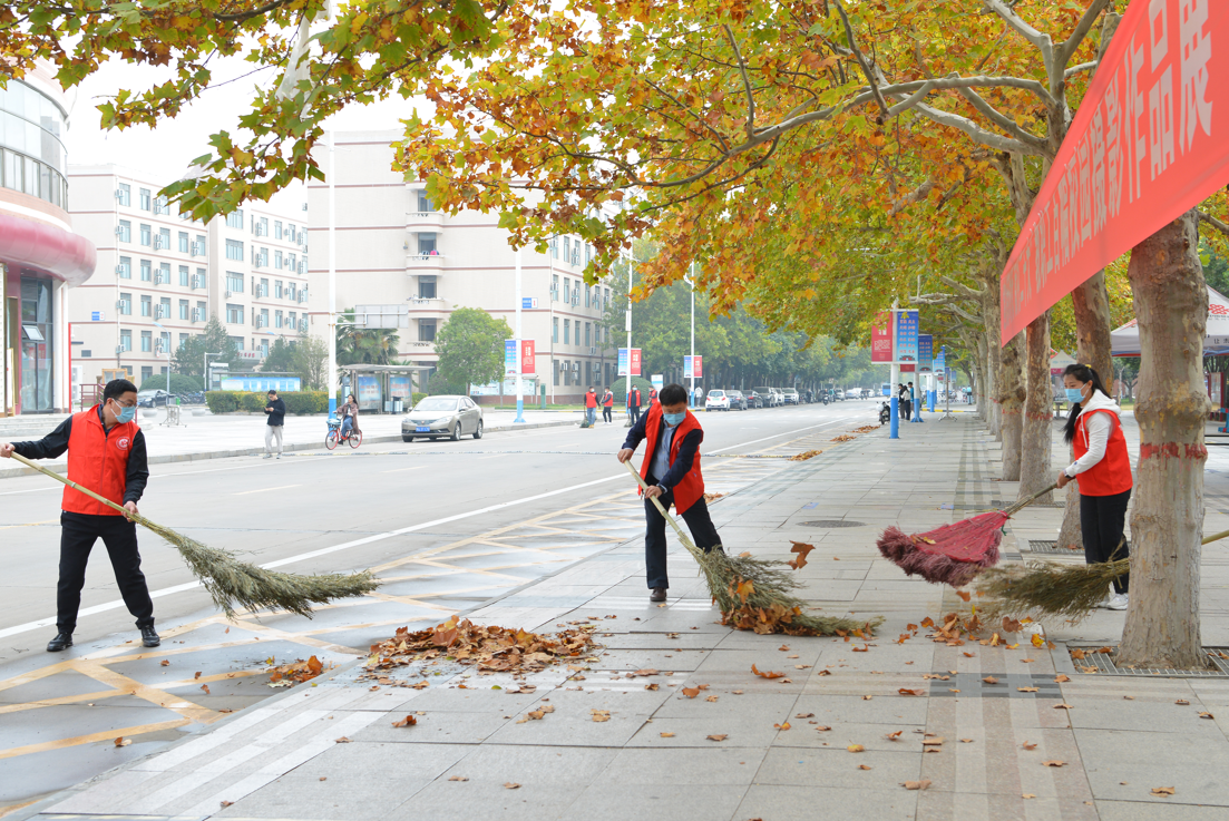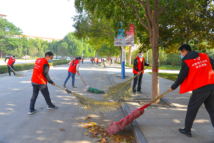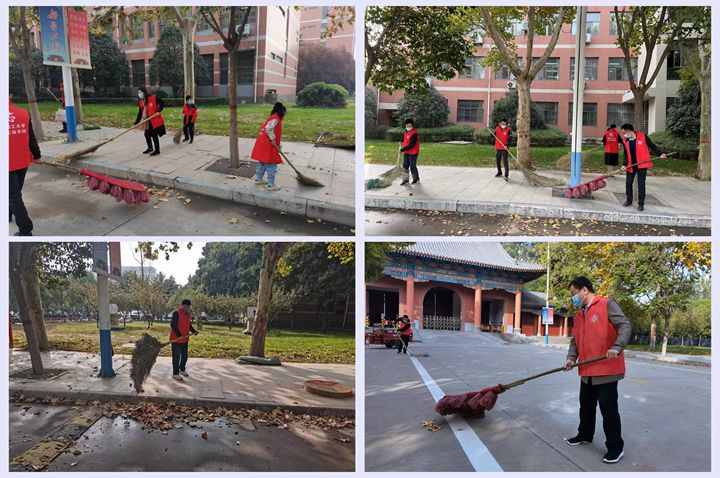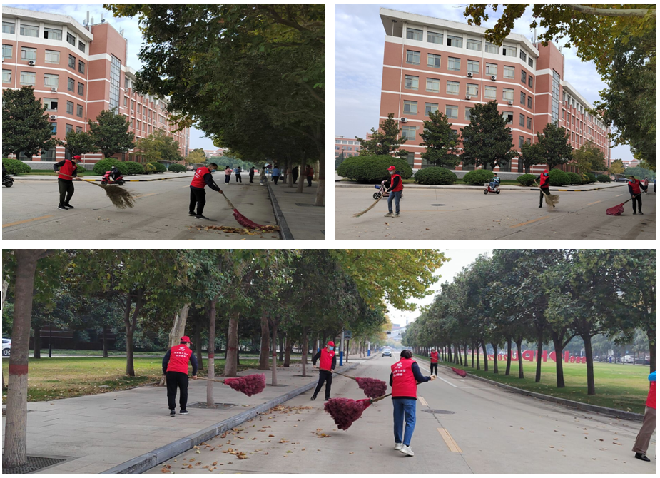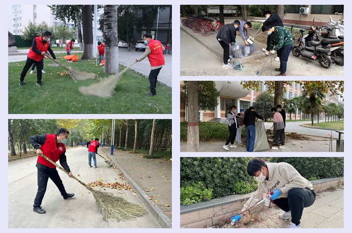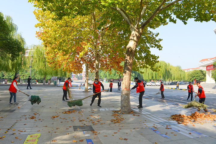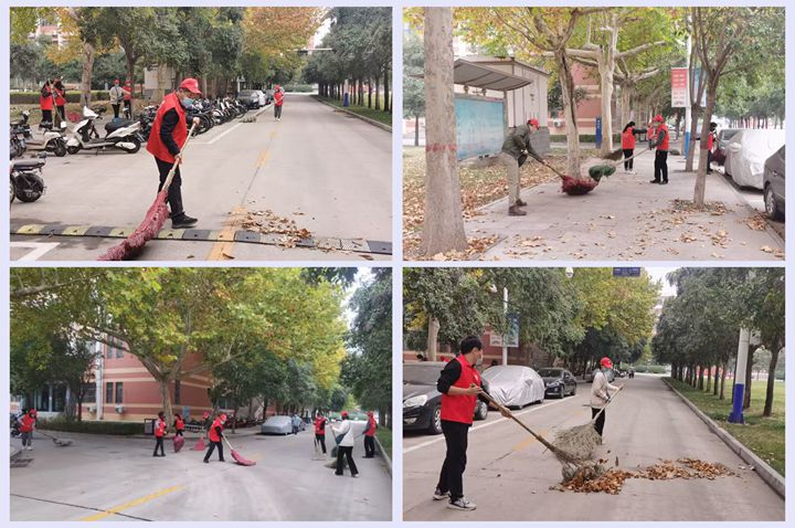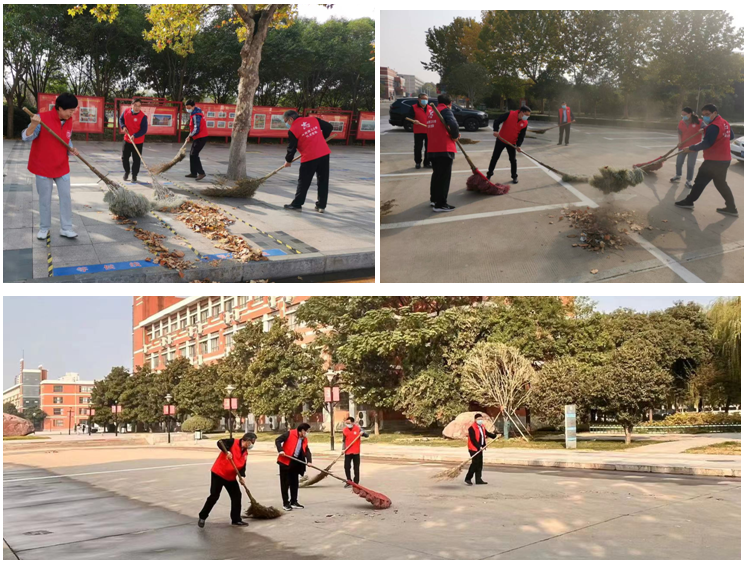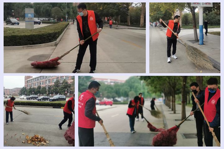 维护校园环境,助力疫情防控。10月25日上午,校长杨小林带领校办党支部党员志愿者们,在南校区春秋大道、明德广场清扫落叶、打扫卫生,共创美好环境、共建美丽校园!