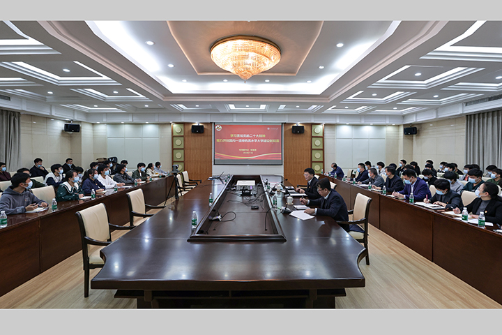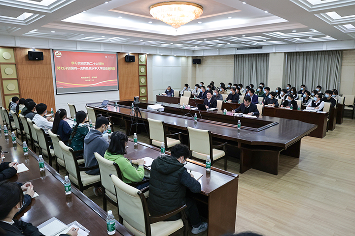 邹友峰指出,学习宣传贯彻党的二十大精神是学校当前和今后一个时期的首要政治任务。党的十八大以来,学校坚决贯彻党的教育方针,坚持社会主义办学方向,落实立德树人根本任务,扎根中原大地,持续深化改革,加快推进内涵建设,学校各项事业实现高质量发展。今后一个时期,全校干部师生要在全面学习、全面把握、全面落实党的二十大精神上下足功夫,坚持不懈用习近平新时代中国特色社会主义思想凝心铸魂,坚定捍卫“两个确立”,坚决做到“两个维护”,落实立德树人根本任务,深入实施“双一流”创建,改革创新、开拓进取,努力开创国内一流特色高水平大学建设新局面。