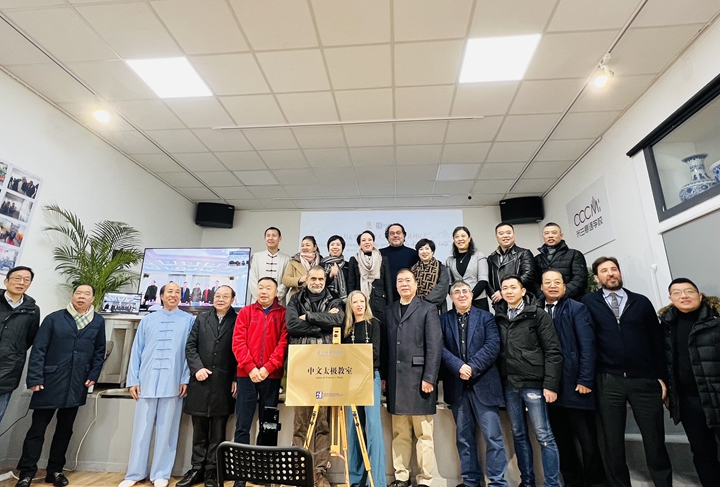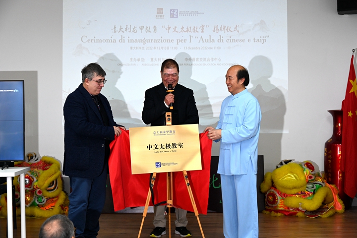 本网讯 (通讯员 王天琪/文 记者 李为群/图)我校与意大利龙甲教育共同申报并获批全球首个“中文太极教室”。12月13日,“中文太极教室”揭牌仪式以线上线下相结合的方式在意大利米兰龙甲教育总部举行。教育部中外语言合作交流中心主任马箭飞、我校校长杨小林线上出席活动,意大利龙甲教育校长李群来、伦巴第大区教育厅私立教育局局长莱蒂西亚、米兰华人华侨工商会会长周立新、全意功夫联合会主席瓦尔特、意大利费米高中校长朱塞佩等现场出席。学校校办、国际处、文法学院、体育学院、外国语学院负责人参加活动。