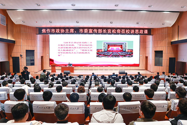 本网讯 (记者 裴建伟 通讯员 田清扬/文 记者 李为群/图)3月31日,焦作市政协主席、市委宣传部长宫松奇在新图书馆A厅讲授题为《从“三特别”的焦作精神和“三不怕”的老山精神感悟中国共产党的精神力量》的思政课。校党委副书记石培哲主持,党办、宣传部、学工部、研工部和校团委负责同志,本科生、研究生、学生干部及青马社成员代表等300余人一同聆听。