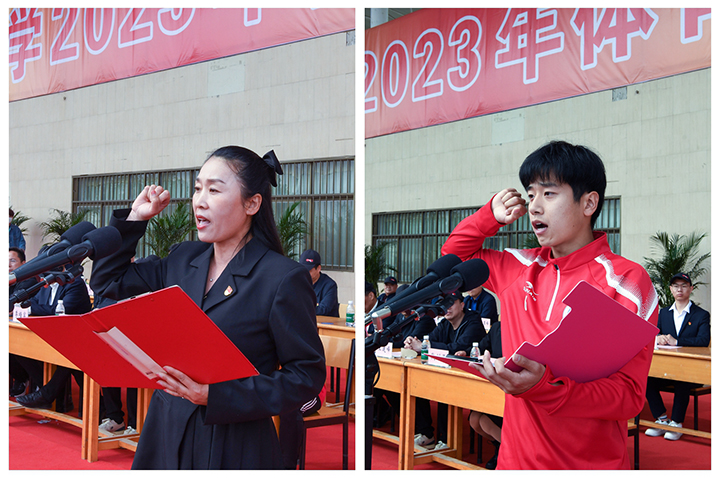 裁判员代表王玉真和运动员代表王世显分别代表裁判员、运动员宣誓。